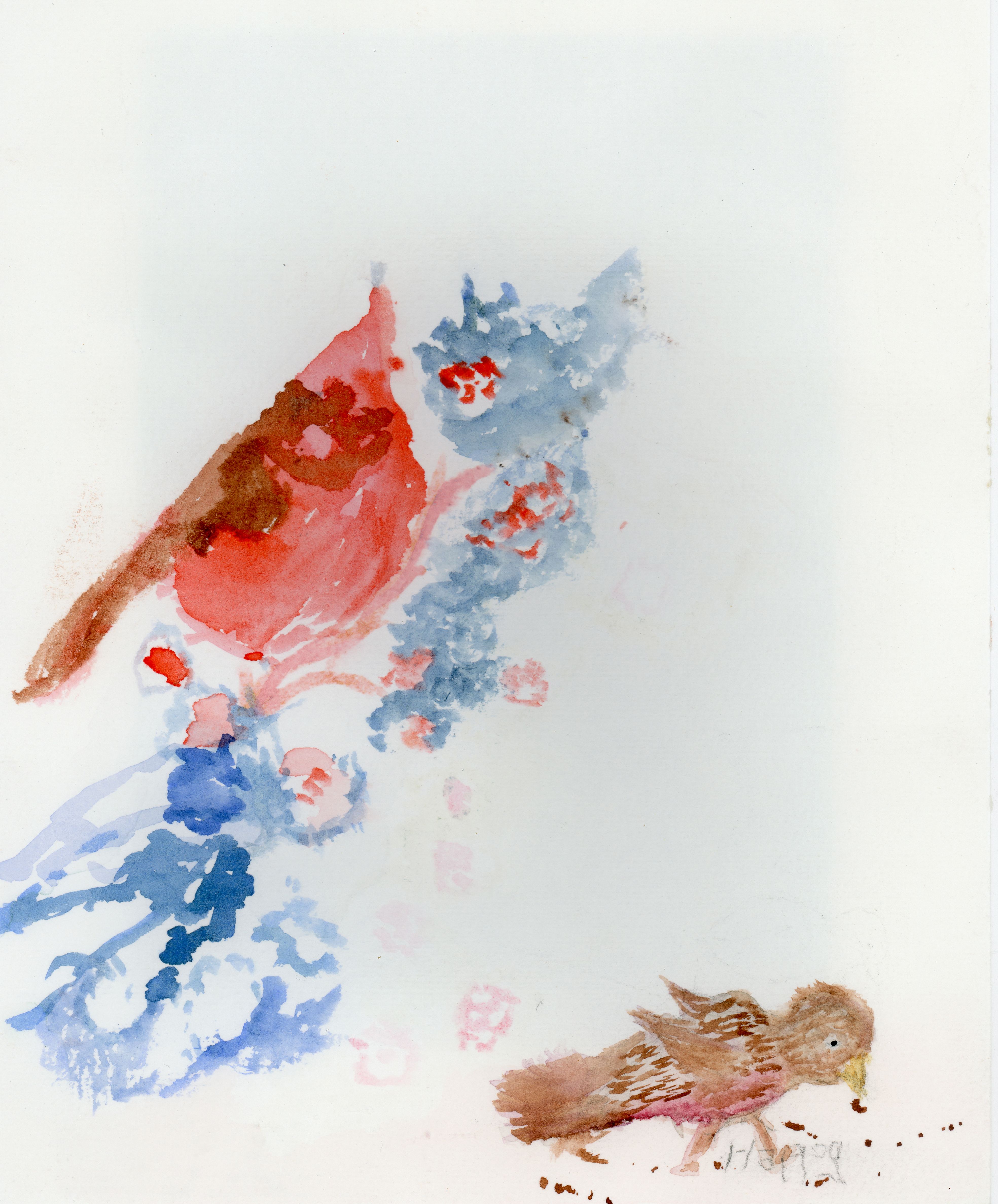 Birds at the feeder just outside Happy’s sunporch window, painted when she was in her nineties and almost blind. Courtesy of Barbara Hail, Warren, RI